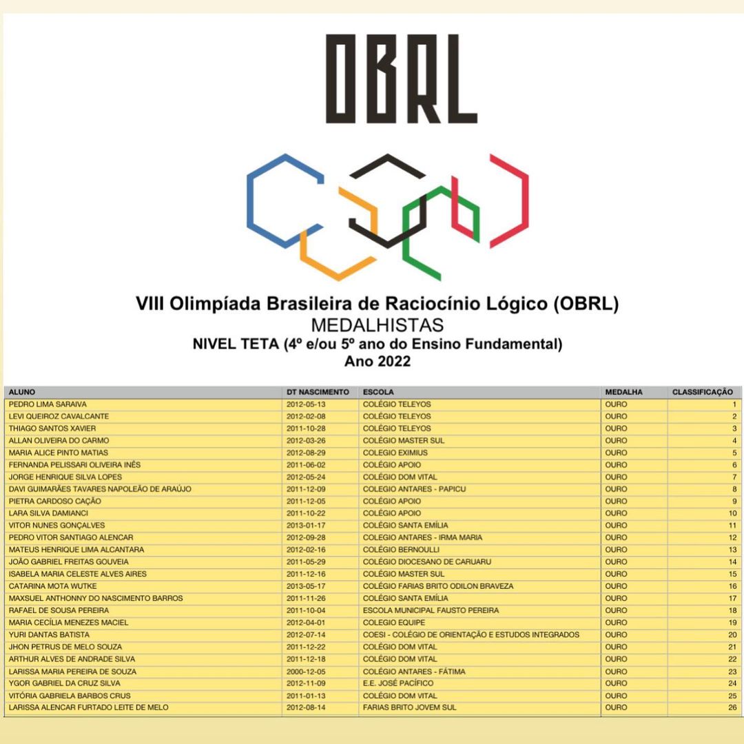 Aluno Allan Oliveira do Carmo,10 anos, filho de Itaitinga, cursa o 5° ano beta no no colégio master sul e foi agraciado com medalha de ouro da olimpíada brasileira de raciocínio lógico (OBRL) de seu nível.